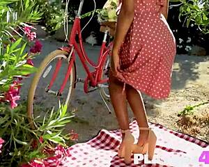 curly black teen 18+ jenna foxx poses with big tits at outdoor picnic 05:23