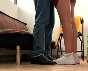 Natural boobs bulge in miniskirt uniform during room cleaning. 😏