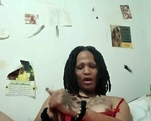 ebony shemale shakes booty while stroking cock