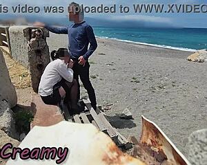 She gives a blowjob and gets fucked on the public beach.